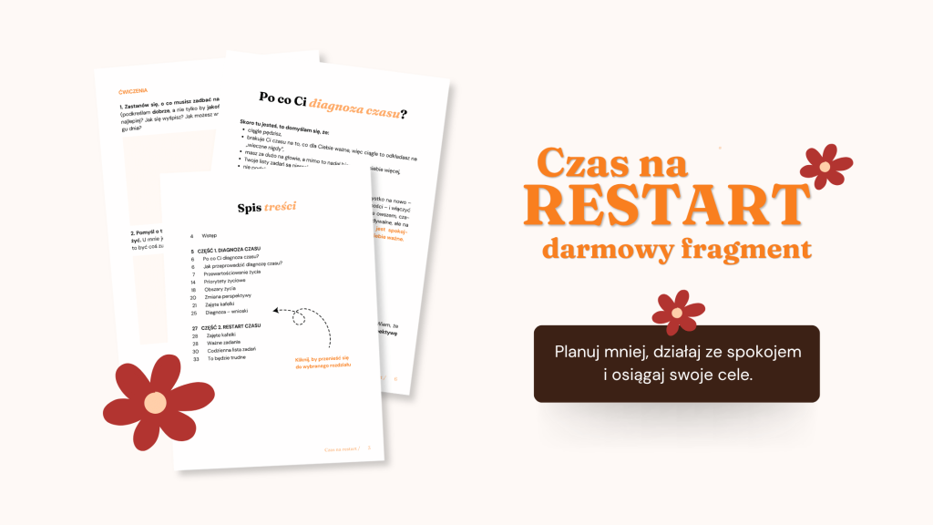CZAS NA RESTART to workbook z ćwiczeniami & dodatkowe narzędzia, dzięki którym na nowo zdefiniujesz swój czas: zobaczysz, gdzie Ci ucieka, co chciałabyś zmienić i jak możesz to zrobić. A potem zrobisz pierwszy krok do codzienności, o jakiej marzysz.