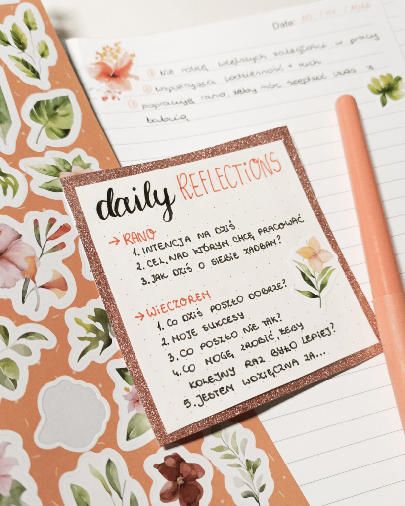 Poranne pytania Daily Reflections mi w tym zdecydowanie pomagają! Nawet nie odpowiadam na nie pełnymi zdaniami, a bardziej hasłami. Ale dzięki temu faktycznie codziennie staram się zrobić coś dla siebie. I pamiętam o najważniejszych celach.