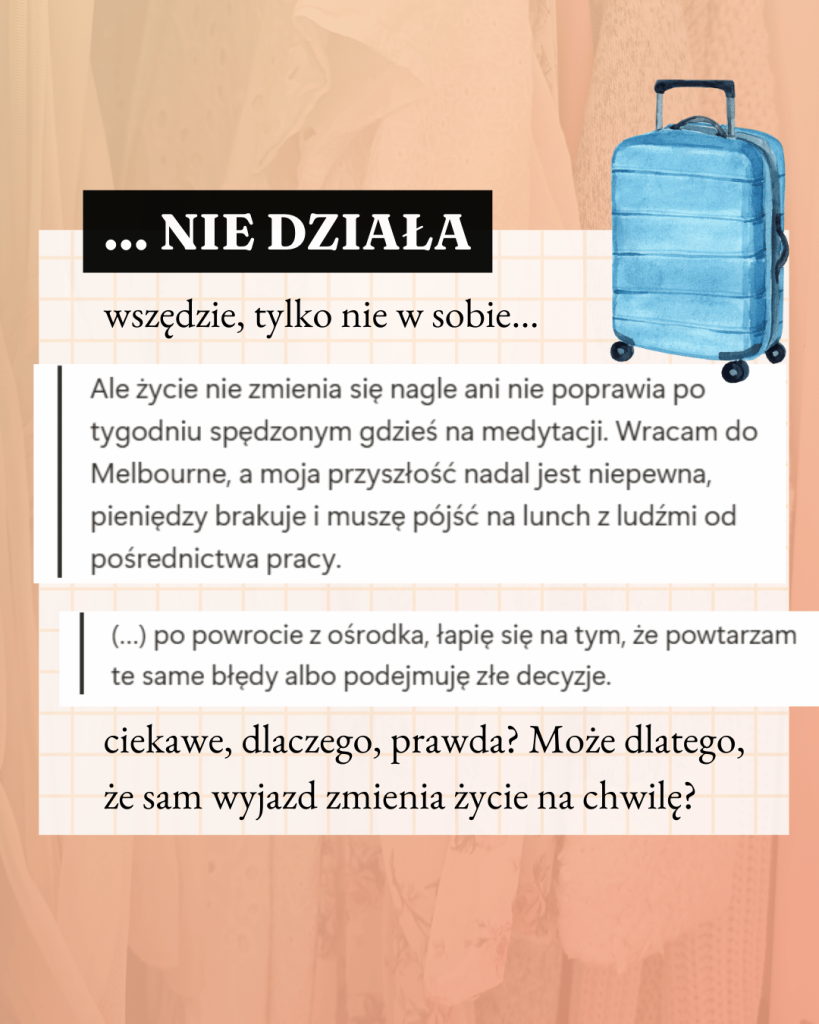 Uważam, że jeśli nie zaczniemy od poznawania siebie, rozmawiania ze sobą, chwili na oddech – nawet najdroższy wyjazd medytacyjny nam nie pomoże, bo gdy tylko wrócimy, znów będziemy w dokładnie tym samym miejscu, w którym byłyśmy wcześniej.